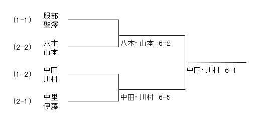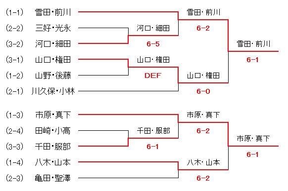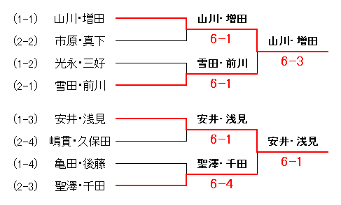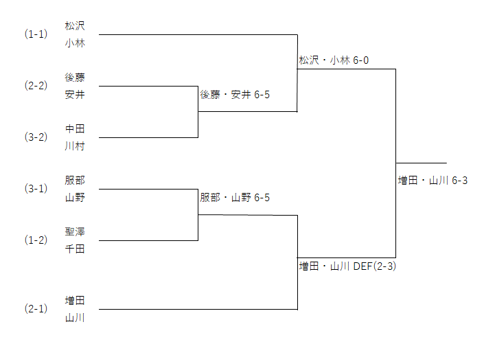 展開は、序盤雪田・前川さんペアが攻めていたが、中盤以降、山川・増田さんペアの粘り強いプレーで、相手のミスが増えてきたように思います。中盤、雪田・前川さんペアも追い上げを見せたが、山川・増田さんペアの攻めと守りの姿勢が崩れることなく、ゲームを進め勝利をつかみました。