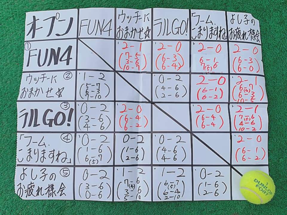 序盤、両ペアとも、ボールを沈めて浮いたボールを決めて加点していましたが、3-3あたりから増田・山川さんペアがストロークで相手のミスを誘い得点を重ねていき、そのまま結果となりました。